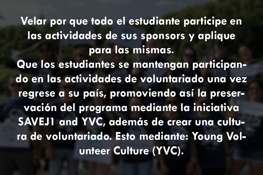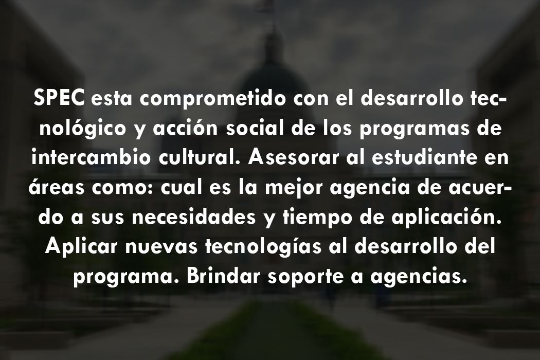 Somos una entidad encargada del desarrollo tecnológico de agencias dedicadas al intercambio cultural y desarrollo y protección del J1 Exchange Visitor Program por medio de acción social. Nuestro compromiso es brindarle al estudiante dominicano la asesoría necesaria para que pueda disfrutar de su intercambio cultural al máximo así como facilitar todo su proceso, nosotros como sponsor hemos visto la necesidad del estudiante dominicano de ser instruido y asesorado en diversas áreas relacionadas al programa así como brindarles servicios necesarios para que su programa sea todo un éxito.